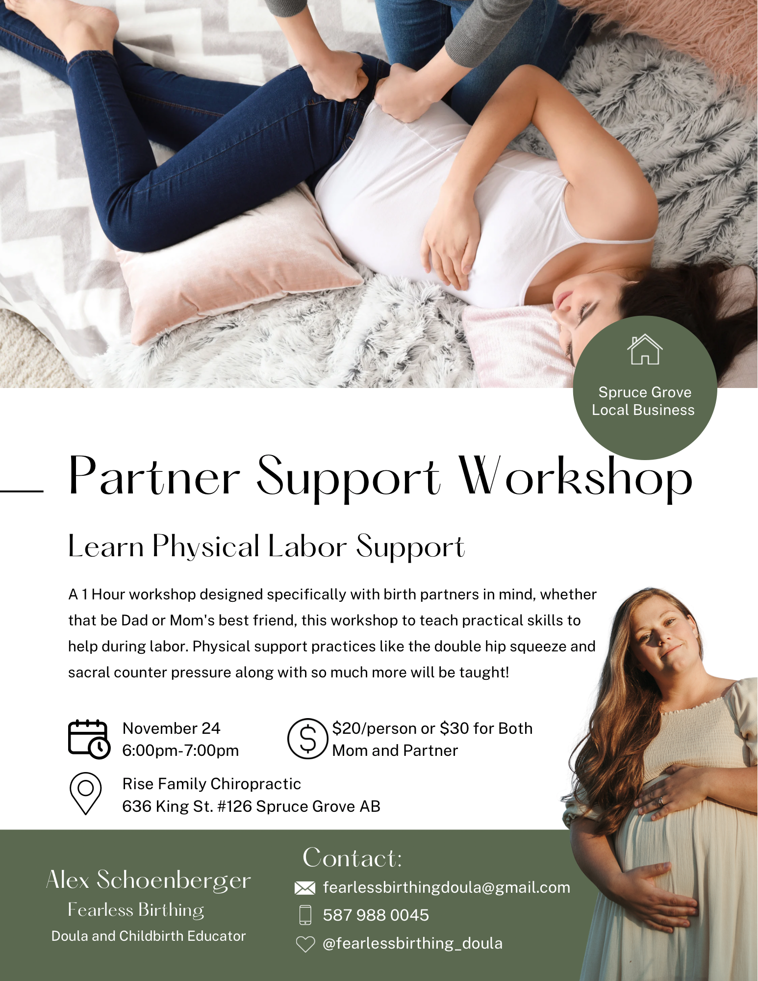Interested in getting your partner involved and educated on how to physically support you through labor? Come attend an in-person workshop or sign up for the virtual workshop!